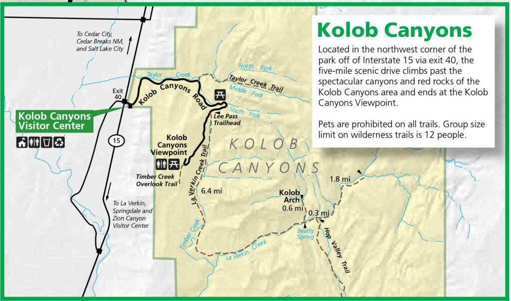자이언국립공원의 북쪽에 있는 캐니언입니다. 자이언 캐니언과 너무 떨어저 있어서 방문자가 많지 않습니다. 인터스테이트 하이웨이 15번의 40번 출구로 나가면 방문자 센터에 도달합니다. 5.5마일의Kolob Canyon Road를 가면서 캐니언 경치를 볼 수 있습니다. 왕복 14 마일 트레일로 가야 볼 수 있는 콜롭아치(Kolob Arch)는 310피트폭의 세계에서 가장 큰 아치라고 합니다.