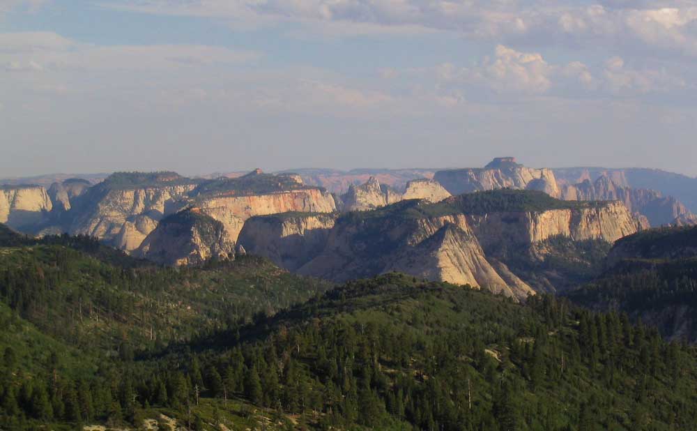 동쪽 공원 입구에서 가까운 곳에 바둑판같은 바위산을 볼 수 있습니다. Checkerboard Mesa라는 이름이 붙은 곳입니다. 길가에 정차하여 잠시 보고 갈 수 있도록 되어 있습니다. 9번도로변에서 시작하는 트레일로 Canyon Overlook Trail이 있습니다. 캐니언을 내려 볼 수 있다고 해서Overlook트레일이라는 이름을 부친 것입니다. 자이언 캐이언에서 간다면 동쪽 9번도로로 Pine Creek Canyon을 꼬불꼬불 돌아 오른다음 사암절벽 바위를 평행으로 뚤어 만든 1.1마일이나 되는 긴 굴을 통과해서 계곡 위로 나오면 도로 남쪽편에 주차장이 나오며 이곳에 차를 세울 수 있습니다. 길을 건너 북쪽편에서 트레일이 시작됩니다. 트레일 끝에 가면 자이언캐니언 남쪽 계곡과 그뒤의 웅장한 Temples, Towers산이 보이며 9번 도로가 터널입구까지 꼬불꼬불 올라오는 경치를 내려 봅니다. 트레일은 왕복 1마일(1.6km)이며 고도 변동은 200ft(61m), 대략 한시간 정도 걸립니다.