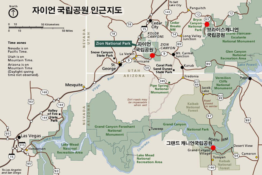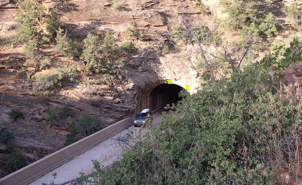 애리조나에서 출발하는 경우에는 Flgstaff에서 89번 도로로 129마일을 달려Page에 와서 89번으로 74마일을 서쪽으로 더 가면 Kanab에 도착합니다. 거기서 89번으로 북상 하여 17마일을 가면 Mt Camel Junction에 도달하는데 여기서 9번 도로로 좌회전하여 13마일을 가면 공원에 들어가게 됩니다. 이 길은 공원에 들어서면서 1마일의 긴 터널을 지나게됩니다. 터날의 폭이 좁기때문에 큰 트럭이나 RV는 공원 레인저의 특별 도움을 받아 터널을 일방 통행으로 통제를 받아야 하는 번거러움이 있으며 $15의 통행요금(왕복)도 지불해야하며 통행할 수 있는시간도 제한되어 있습니다. 웹사이트를 통해서 시간 확인을 미리할 것을 권합니다. <웹사이트링크>https://www.nps.gov/zion/planyourvisit/the-zion-mount-carmel-tunnel.htm 위의 사항은 일반 승용차에게는 해당되지 않는 사항이지만 밤 10시부터 새벽 5시까지는 터널의 사용이 금지된다는 사실은 모든 차량에게 적용됩니다. 단 토요일은 예외여서 24시간 사용가능 합니다.