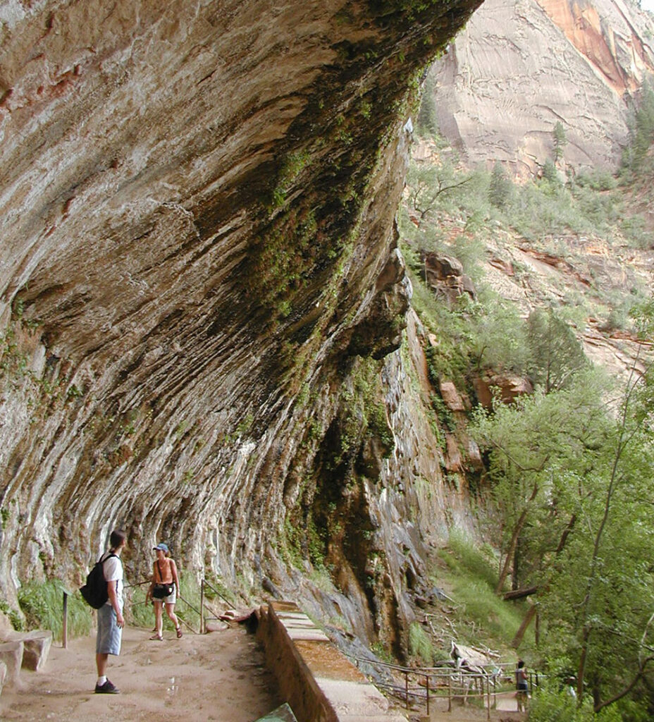 우는 바위. 무엇이 시온의 바위를 울게 하였을까요? 이곳은 사막지대입니다. 그러나 고원 높은 곳에는 비와 눈이 내려 나바호 사암으로 스며들어갑니다. 물이 통과하기 어려운 단단한 층에 도달할 때까지 서서히 내려간 다음, 물은 바위에서 옆으로 밀려나와 샘물이 되어 밖으로 나옵니다. 우는바위의 샘물은 바위에 매달린 섬세한 양치식물과 꽃들에게 끊임없이 영양을 공급해주고 키워줍니다. 버스에서 내리셔서 우는바위까지 산책을 해보시기 바랍니다. 오솔길은 약간 가파르지만, 왕복 반 마일밖에 안 됩니다.(주:금년은 방문할 수 없습니다)
